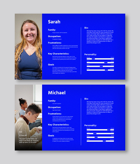 After interviewing a few occupational therapists, and observing the behavior of a few people with ASD, I was able to generate 2 personas relating to people who would interact with the application.
