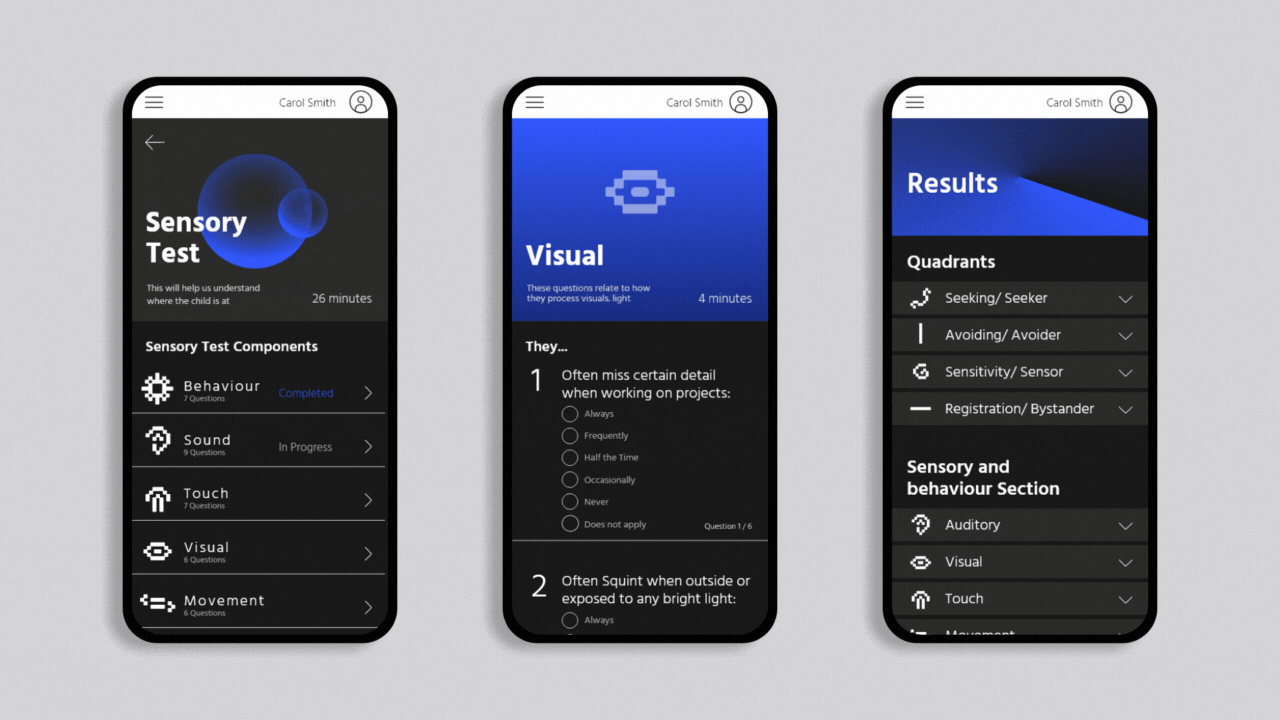 Often it can take a while to diagnose and get an understanding of someone’s sensory needs, especially when it requires the help of trained professionals. Underload can streamline a lot of that process in the Sensory Test. With questions on behaviour, Movement, Sounds, visuals and touch, Underload can give a summary of their sensory needs whilst automating a lot of other features.
